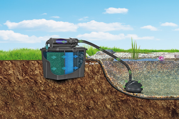 Kompakt átfolyó szűrőkészletek 5-16000 literes tavakhoz, "tisztavíz garanciával". UVC-előtisztító készülékkel a lebegő algák ellen. Egy vagy többkamrás szűrőedény különböző szűrőanyagokkal (nagylyukú és finomlyukú szűrőszivacsok) az optimális víztisztítás érdekében. Nagyteljesítményű szűrőszivattyú 4 mm-es szűrőnyílásokkal, tömlővel, valamint az összes szükséges csatlakozóval.